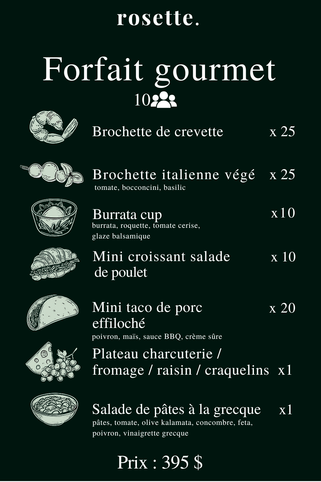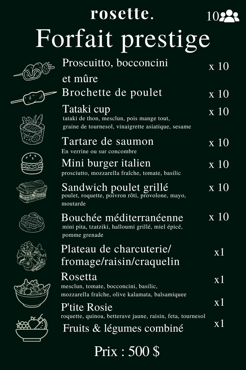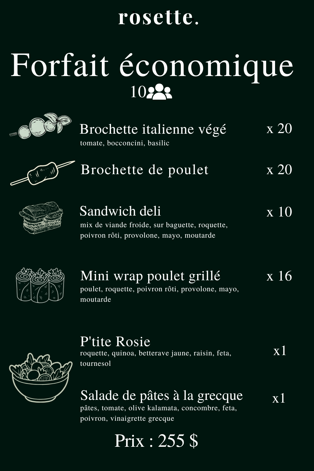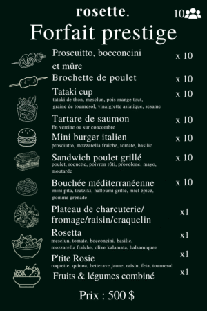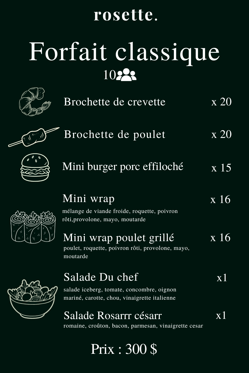 | Choix du forfait | Économique, Classique, Gourmet, Prestige, Végétarien |